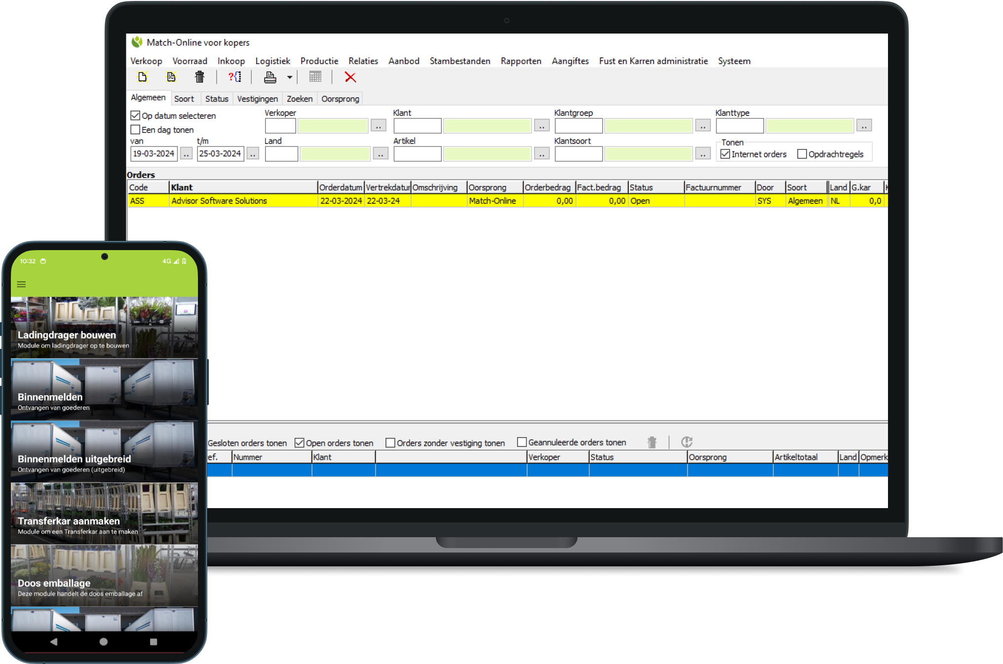 Match Online, ontwikkeld door Advisor Software Solutions, is een softwarepakket dat een geïntegreerd ERP-systeem en webshop combineert. Het biedt een alles-in-één oplossing voor de sierteeltsector, waarbij het ERP-systeem bedrijfsprocessen beheert en de webshop producten aan afnemers aanbiedt, naadloos gekoppeld aan het ERP-systeem.